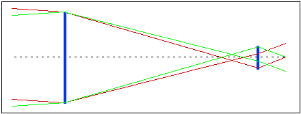 The red lines illustrate a light bundle coming from the 'top' of an extended object. The green lines from the 'bottom'. The same thing happens as in the figure for a pinpoint object, but now the red and green light bundle exits under an angle from the eyepiece. The angle between the incoming red and green light bundle and the angle of the outgoing red and green light bundle is different. In fact this difference is the magnification.