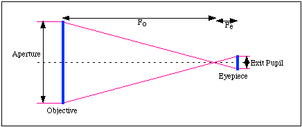 In the drawing above the light enters the objective (from the right) and is brought to a focus at the distance Fo (the focal length of the objective). The light continues its path until it strikes the objective after a distance Fe (the focal length of the eyepiece). After the eyepiece the light again forms a parallel bundle, the diameter of which is called the exit pupil.
