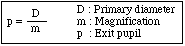 The exit pupil of a scope is the diameter of the light bundle from a pinpoint object coming out of the eyepiece when the focal point of eyepiece and of the primary mirror are coincident. (i.e. occupy the same location)The diameter of the exit pupil can be calculated by the following formula: