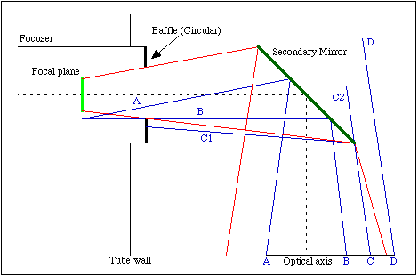 However, the part of the lightcone between the lines B and C-C1 is now cut off by the focuser baffle. (Note: that the line B, after reflection, is horizontal is pure coincidence)