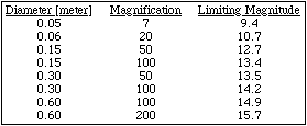The above table is only valid for pinpoint light sources. For extended objects the properties of the eye/brain combination become more complex, but the same principle as above is valid, i.e. larger diameter = better detectability. See "Visual Astronomy; Optimum Detection Magnification" by Mel Bartels.