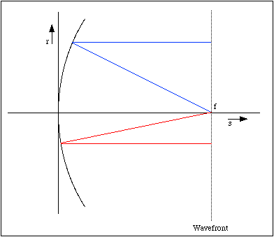 In the above figure the wavefront is drawn through the focal point, this is a mere coincidence and has no implications. It should also be noted that the mirror curvature is not corresponding to the focal length.