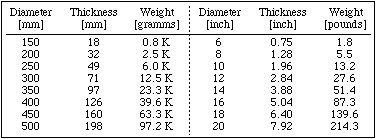 The weight of the mirror depends on it's volume. As can be seen from the above relation, the volume will increase dramatically for larger mirrors. This is shown in the table below.