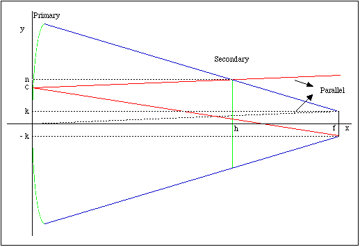 Only the minor axis of the secondary is shown. The black line at the focal point "f" represents the unaffected area and is in this case equal to the fully illuminated area. The red line shows the path of a light ray coming from an object at the edge of the unaffected area.